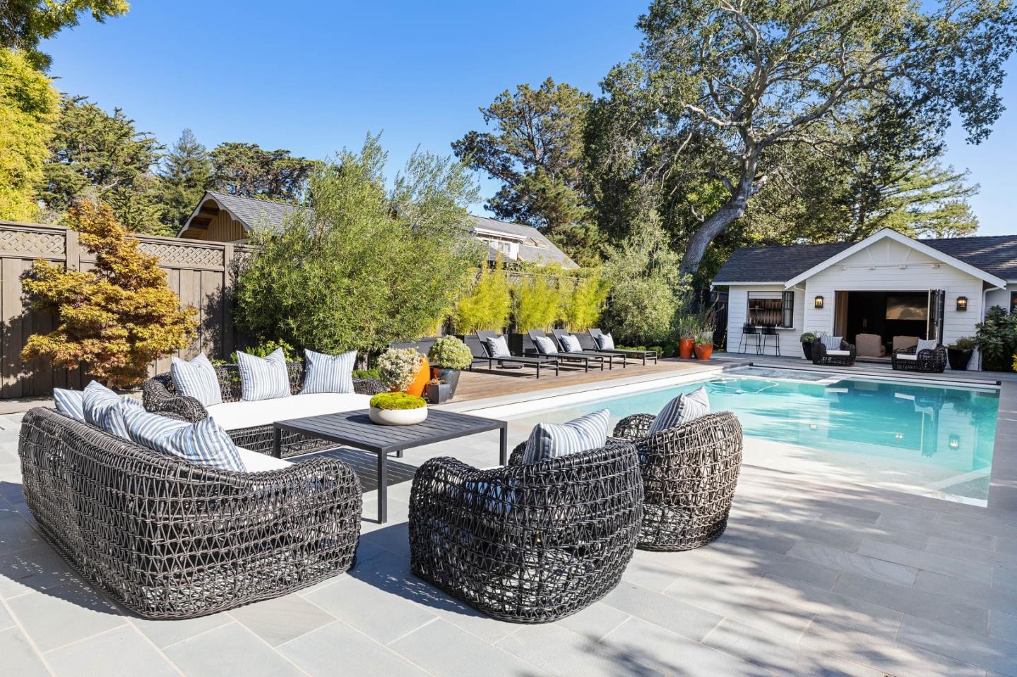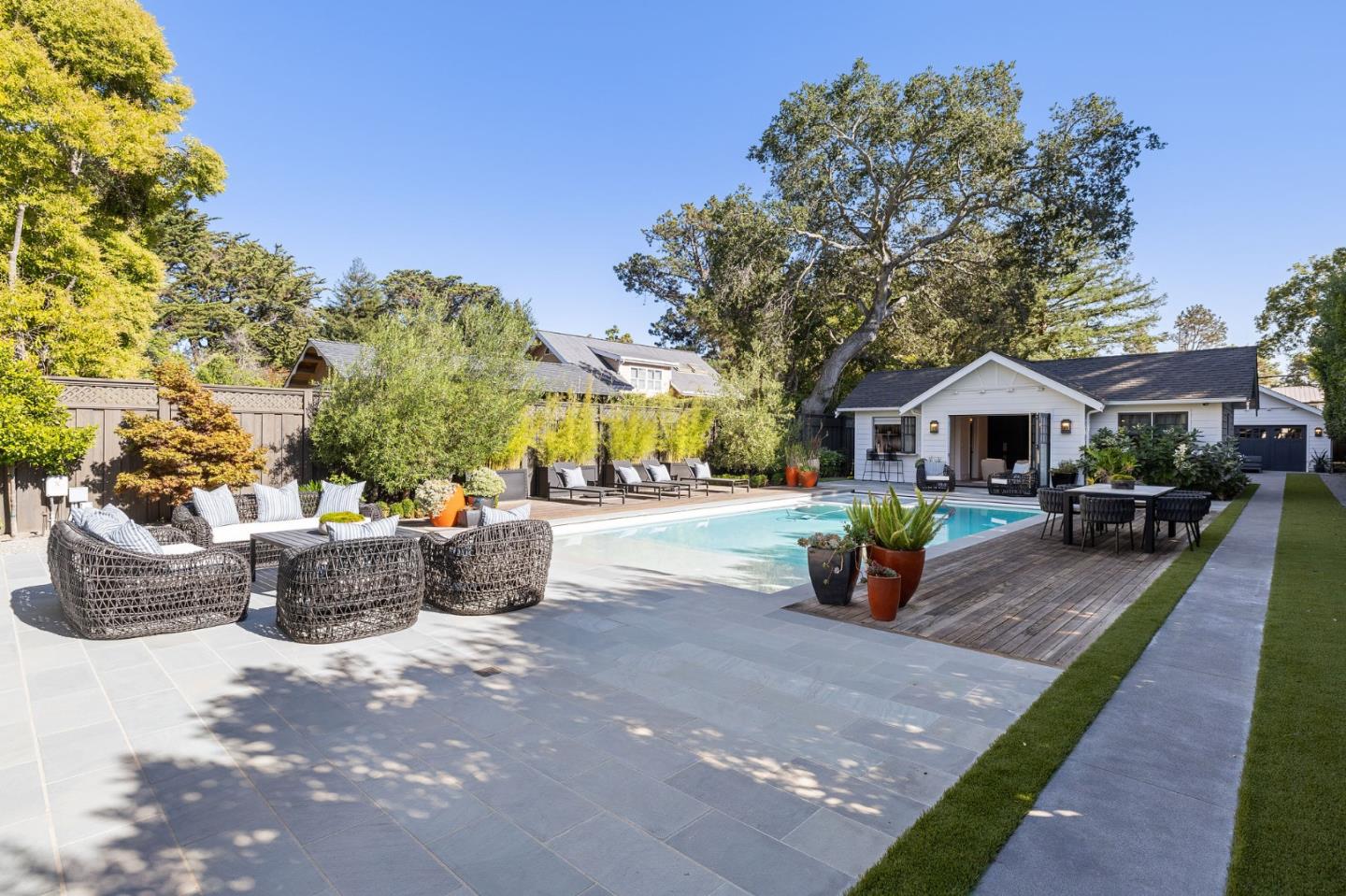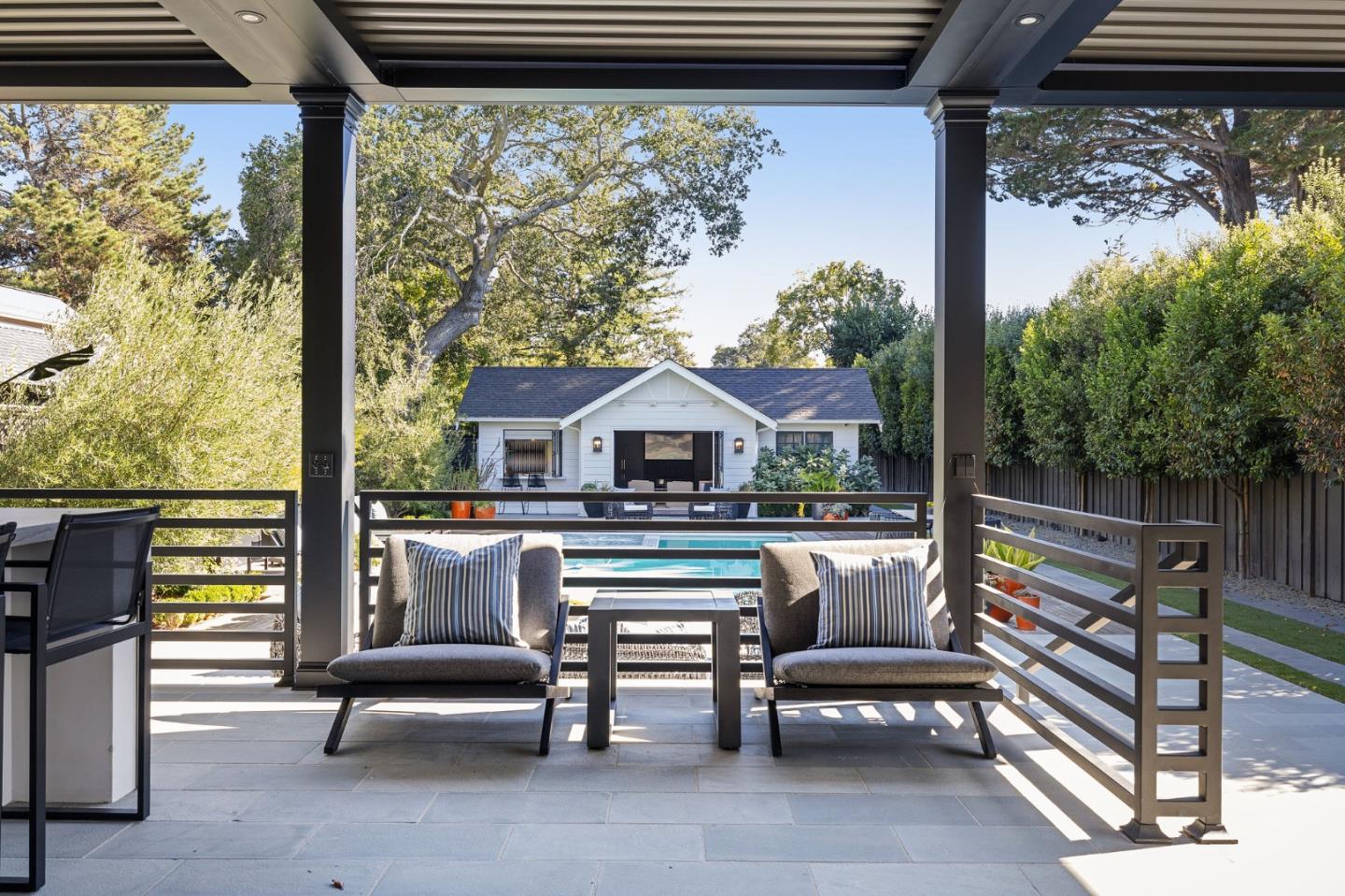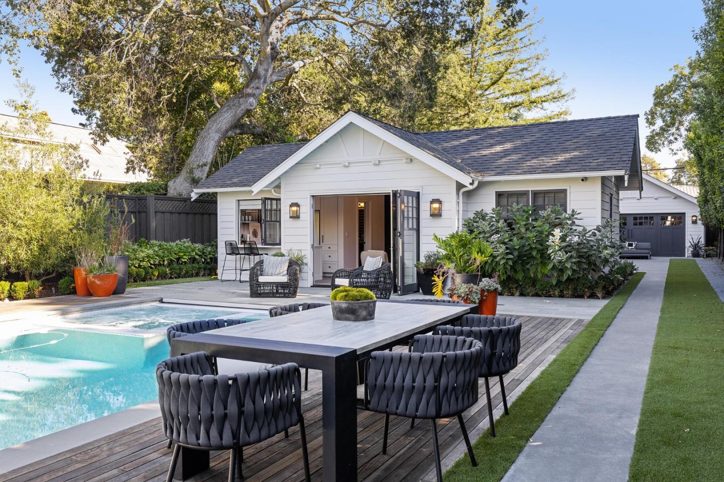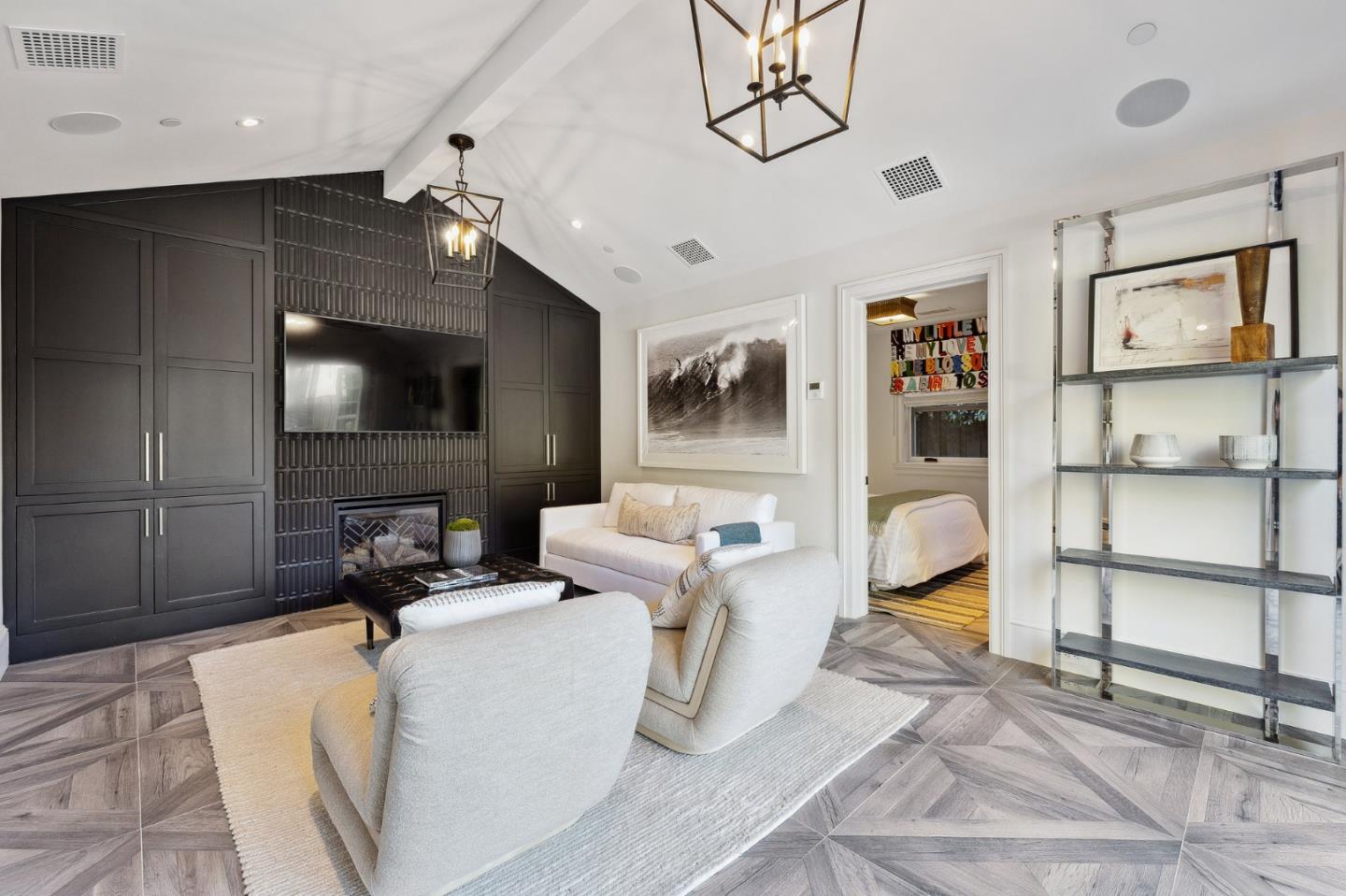 Luxury New Construction in the park! The main house includes 5 beds/5.5 baths, and the ADU/guest house is 1 bed/1 bath. Approx 5,855 sq ft of total custom luxury living space and high-quality finishes & detail. Custom interior design, tile finishes, designer wallcoverings, light fixtures, window coverings, wired and high tech. Open living connects gourmet kitchen and family room with dual folding doors to entertain under commercial-grade Pergola X overlooking pool/spa & guest house. Formal dining area with twin custom wine refrigerator, lacquer painted home office with built-ins & tequila bar. Primary suite, spa-like ensuite bathroom, patio, walk-in custom closets. Wireless home security system, Sonos technology, speakers embedded in every room and around the lot, smartphone-controlled. Meticulously landscaped, basketball court, firepit lounge, infrared sauna, home gym/2 car garage. Conveniently located to schools, downtown Burl Ave, commute SFO, Chase Center & Silicon Valley.